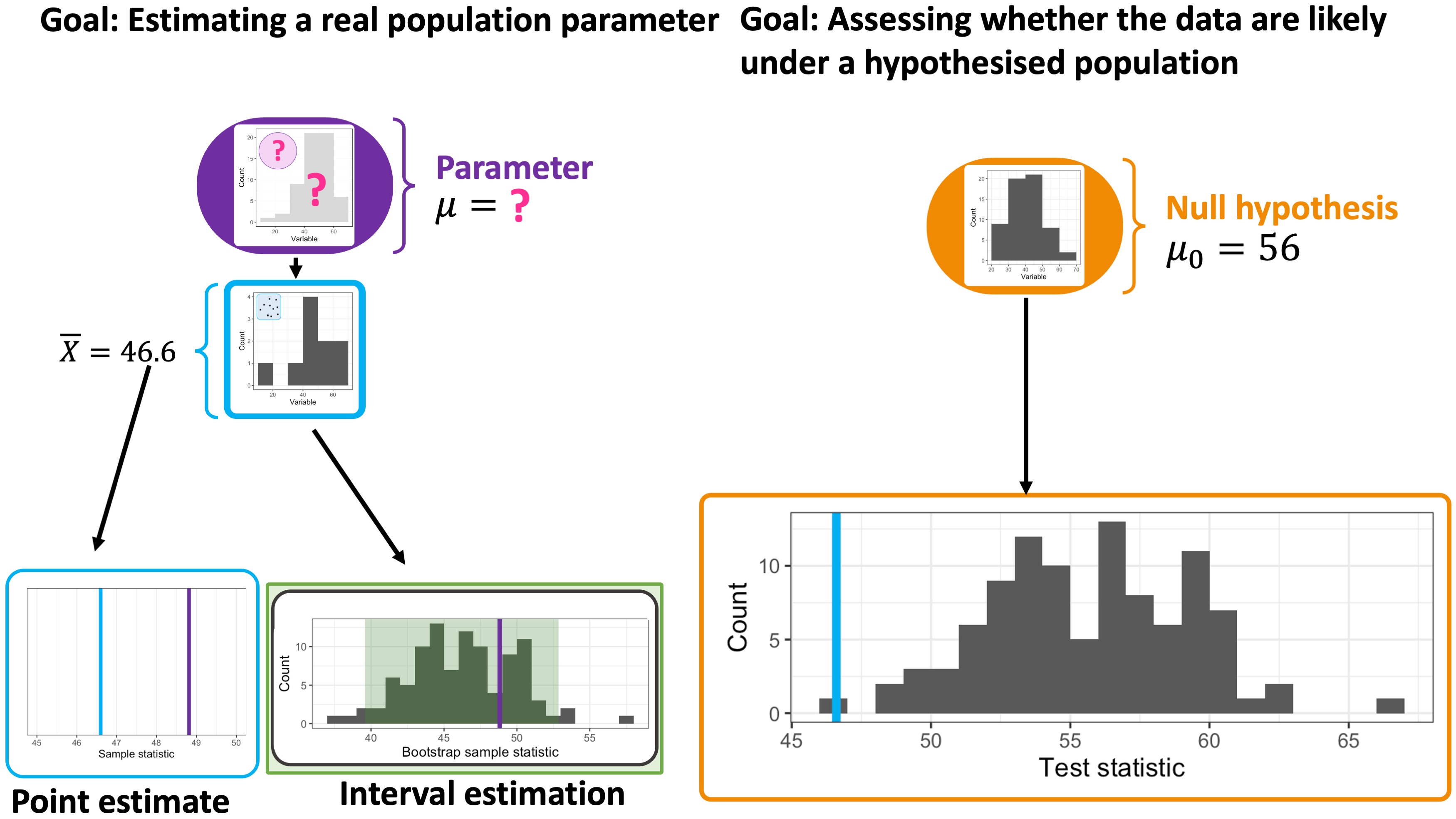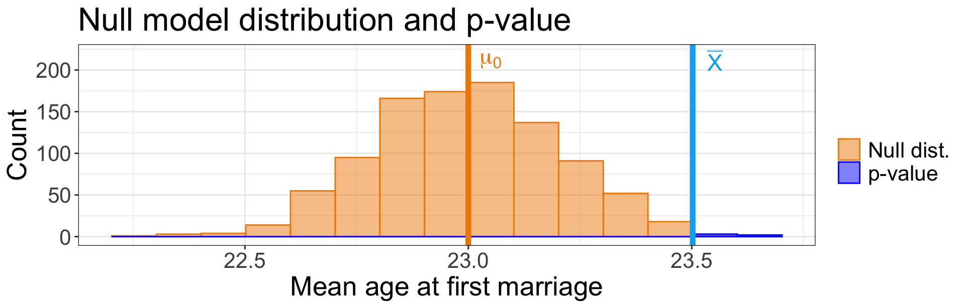 infer packagespecify() the variables of interest in your data frame.generate() replicates with replacement.calculate() the summary statistic of interest.hypothesize() set the null hypothesis.visualize() the resulting null distribution.get_p_value() for our test.Concept